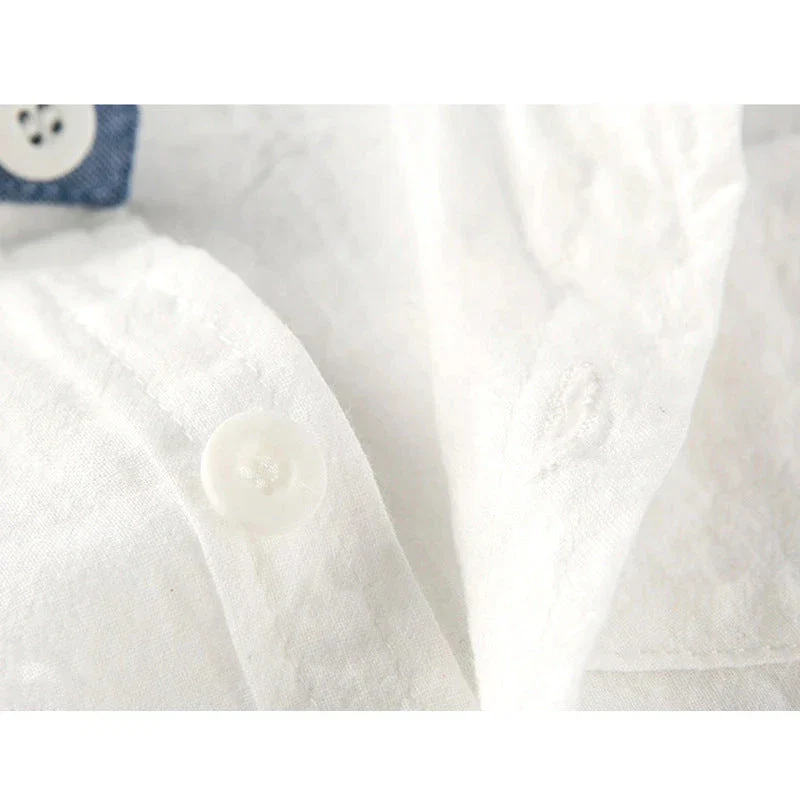 This lightweight summer outfit includes a short-sleeve romper with hidden snap buttons and matching overalls, blending European-inspired elegance with baby comfort.